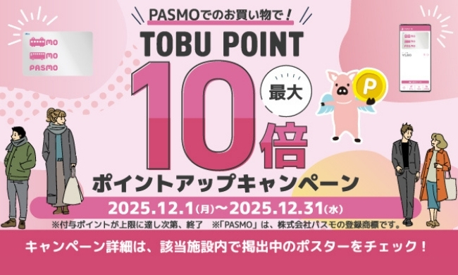 会員向け2025/12/01〜2025/12/31【エキア池袋・エキチカダイニング】PASMOのお買い物でTOBU POINT最大10倍 ポイントアップキャンペーン -