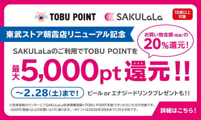 新規入会2026/01/29〜2026/02/28【東武ストア 朝霞店】SAKULaLaのご利用でTOBU POINT最大5,000pt還元!! -