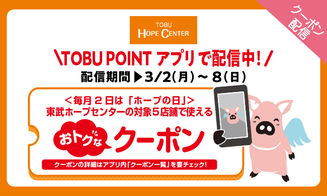 会員向け2026/03/02〜2026/03/08【東武ホープセンター】<毎月2日は「ホープの日」> 東武ホープセンターの対象5店舗で使えるおトクなクーポンをトブポアプリ内で配信中! -