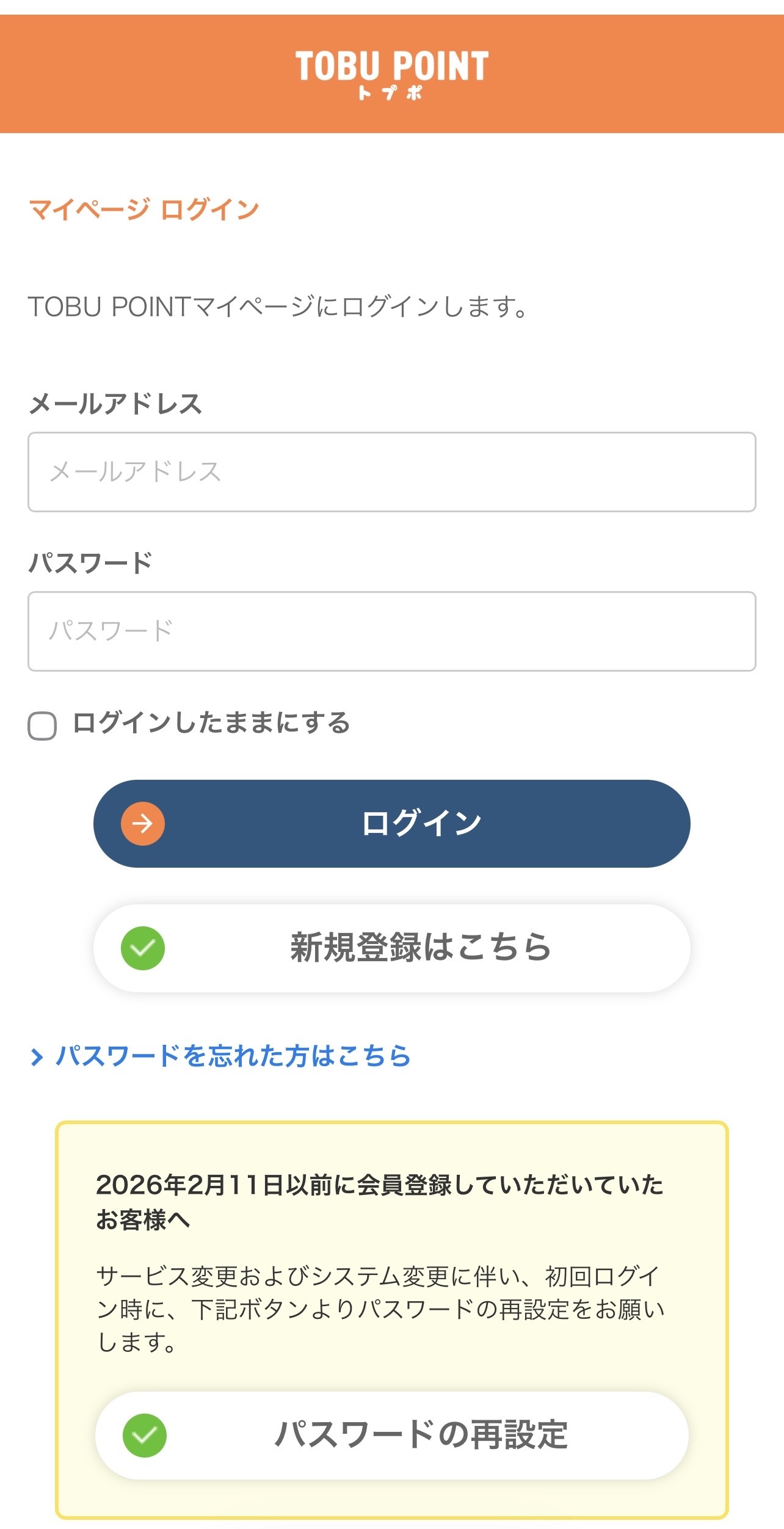 2026年2月12日(木)のシステムアップデートに伴い、TOBU POINTマイページ・TOBU MALLへ初回ログインする際は、すべてのお客様がパスワード再設定の対象となります。