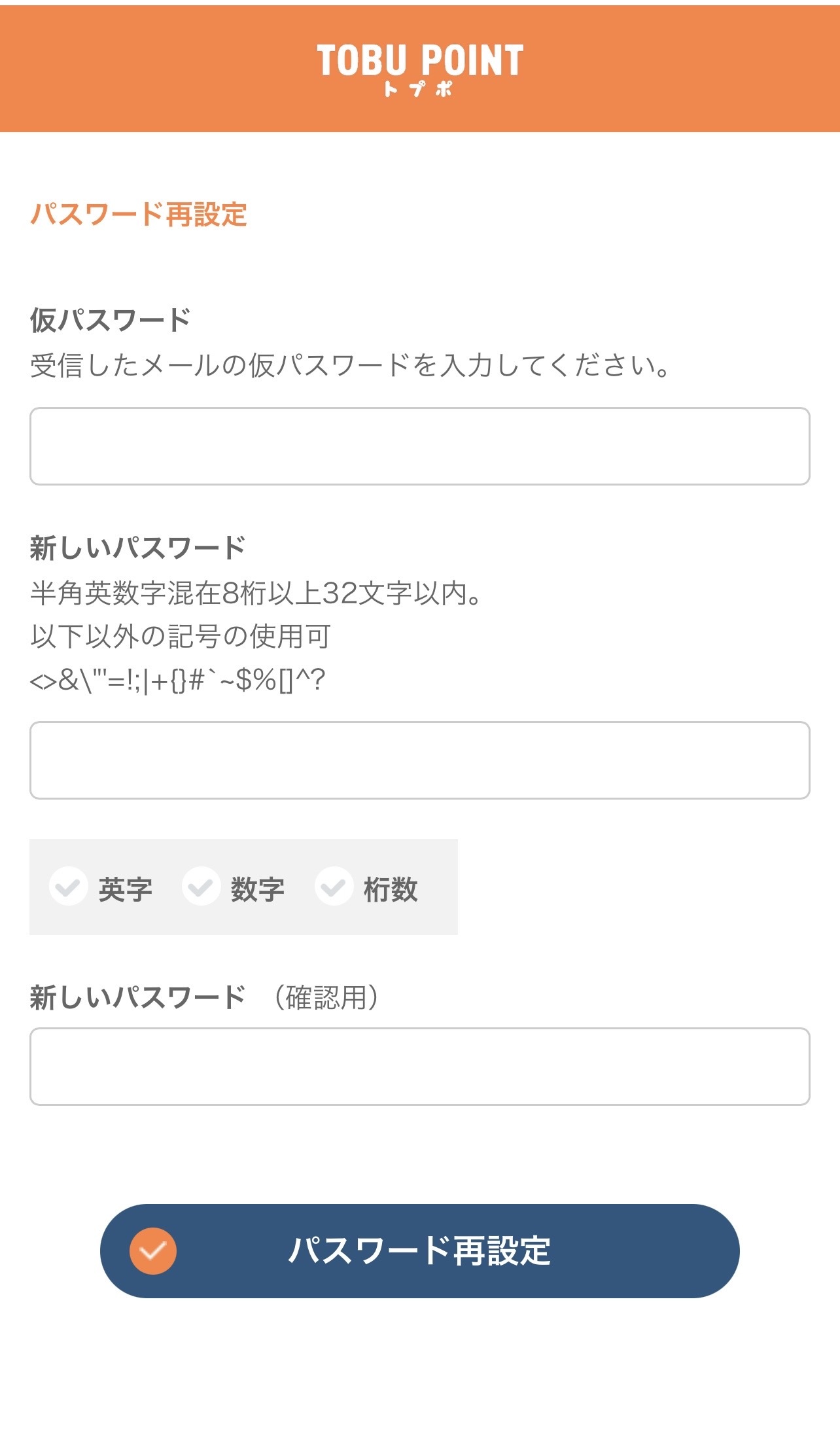 - パスワード再設定はTOBU POINT マイページまたはTOBU MALLログイン時に一度でも行えばOKです。以後、他サービス利用時に都度の再設定は不要になります。